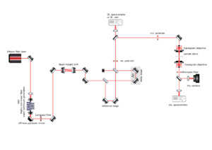 The idea behind this project is to use a fan-shaped grating to couple different wavelengths depending on the position of a light spot on the grating. In combination with a second grating for outcoupling, this setup forms a multiplexer/demultiplexer system for light.
